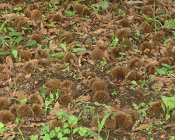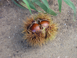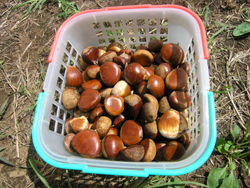 花火会社である株式会社ホソヤエンタープライズのHPを見て知ったのですが、「昼花火」という種類の「号砲」というものなんだそうですね。 参考:花火の科学「花火の種類」 もしかすると、千葉(もしくは関東?)では、運動会の日に号砲が鳴るのは当たり前なのかも知れませんが、ヨソモノの私には、あの朝っぱらからの大音量の号砲には、やはり驚きました。トコロ変われば…ですね。 運動会の季節。千葉はもうすっかり秋です。そよ吹く風も心地よく、涼しいものになりました。そして、近所を歩いていると、 が落ちてくるようにもなりました。 「ひぃ~~!!凶器が落ちてきた!!」 と、恐怖も感じましたが、それ以上に秋を感じたのも事実です。 ということで、さらに秋を感じるために「栗ひろい」に行ってきました!! まず、栗ひろいはどこでできるか、ですが、 千葉県の安全農業推進課のHPに、「農林漁業体験」が出来る場所の一覧があります。 コチラ→「大地と海のグリーン・ブルーツーリズム in ちば」 その中の、農林漁業体験→栗拾いのページを参考にしてみました。 そして、今回はその中から、千葉市にある「若松みどりの栗園」(住所:若葉区若松町2257 ※地図は「ちず丸」を使っています)に行ってきました。 国道51線沿いに走っていると、道路沿いに黄色い看板が見えます。その道を南東に入り、下のような看板がある場所が「若松みどりの栗園」です。 園内に入ると、まだ熟す前の(?)青い栗がたわわに実っていました。 そして、奥にある民家のようなところが受付場所でした。そこで、プラスチック製のカゴと火バサミを貸してもらえます。 管理のおじいさんについて栗畑まで行くと、昨夜吹いた風で落ちたという栗が、地面にぎっしり!! 実も詰まっていて、ツヤツヤのプリプリです。1キログラム800円だという値段をつい忘れて、夢中になって採りました。 2キロ超+栗をいっぱい拾って楽しいな♪の代金…合わせて1700円でした。 もちろん、お店で栗を買った方が安いのは確かですが、こういう秋を感じる体験ができるというのは、思い出という財産になると思います。海の幸、山の幸の豊富な千葉に居る間に、こういう経験をたくさんしたいなーと思いました。 |